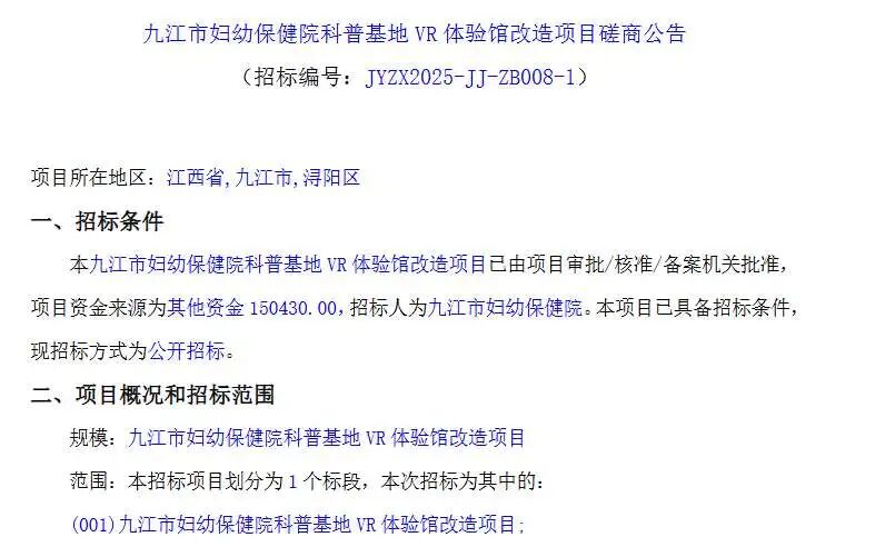 (映维网Nweon 2025年10月13日)本九江市妇幼保健院发布公告,计划以15.043万改造科普基地VR体验馆。